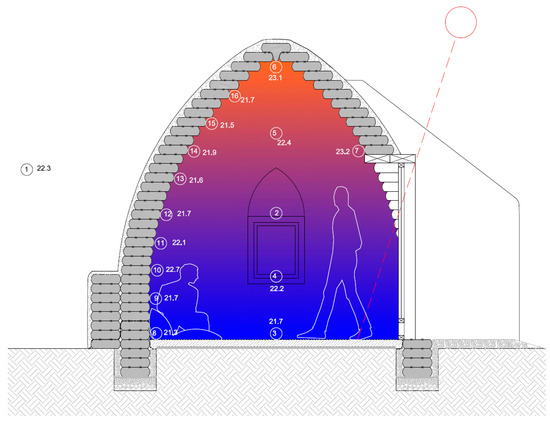 Air stratification inside the Earthbag dome during at solar noon (2 p.m., on 10 June 2018). (Temperature values in °C).