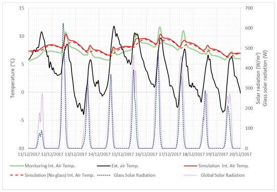 Interior simulated and monitored temperature, exterior temperature, solar radiation and radiation through the glazed surface, during the winter solstice.
