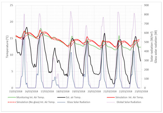 During the equinox period simulation and monitoring data follow a similar trend (Figure 7). In both cases, the thermal amplitude ranges between 1.8–2.2 °C. While the outer maximum temperature is at 3 p.m., inside the Earthbag building the maximum is at 2 p.m., one hour after the maximum solar radiation. This peak of temperature is produced by the direct solar gain through the south glazed door. In this period of the year, the solar radiation incident in the east window is slightly noticed from 8–9 a.m. with a small increase of 0.5 °C in the indoor temperature, clearly visible in the simulation.