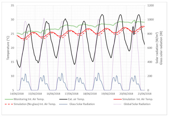 In the summer solstice, the interior temperatures in the monitored and the simulated Earthbag building have a similar tendency (Figure 8). The thermal amplitude for both, simulation and monitoring is a maximum of 2.3 °C. The solar radiation entering through the glazed openings is visible for the three glazed surfaces in the monitoring, and barely visible in the simulation. Due to the relative position of the sun respect to the south facade, the radiation entering in the south glazed opening is inferior than in the other periods, with 200 W around midday corresponding to the maximum solar radiation (12 p.m.–1 p.m.). The shadow produced by the design of the awnings over the windows and the thickness of the Earthbag walls caused enough solar protection to minimize the solar heat gains. In this case, the maximum exterior temperature is around 4 p.m.