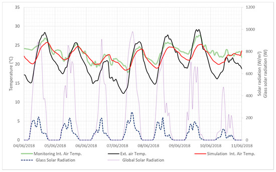 Interior simulated and monitored temperature, exterior temperature, solar radiation and radiation through the glazed surface, during the summer solstice.