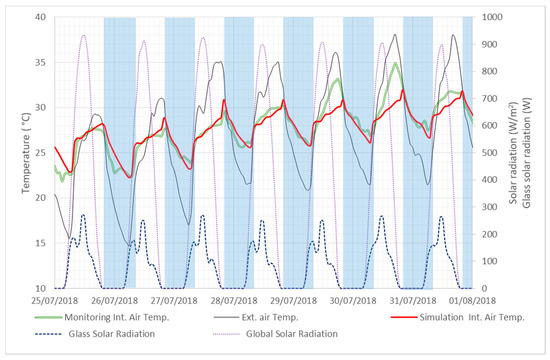 Similar to the previous scenario, the prototype was studied under night natural cross ventilation conditions, where the windows were opened from 8 p.m. to 8 a.m. every day. Figure 10 shows the behaviour of the indoor simulated and monitored temperature, the outdoor temperature and the solar radiation as well as the hours when natural cross ventilation is active. Both monitored and simulated indoor temperatures follow the same trend. In both cases, the maximum interior temperature is reached after the exterior maximum temperature, with a thermal lag about 1 h. The decrement factor is 0.4, higher than previous results, caused by the night ventilation. During the day time, the effect of solar gains through the glazed openings is visible in the small temperature peaks in the morning, midday and afternoon. The nigh ventilation produces also a 5.5 °C decrease from the maximum to the minimum temperatures. The effect of opening the windows can be clearly observed on 26, 27 and 28 July, with a sudden matching of interior and exterior temperatures.