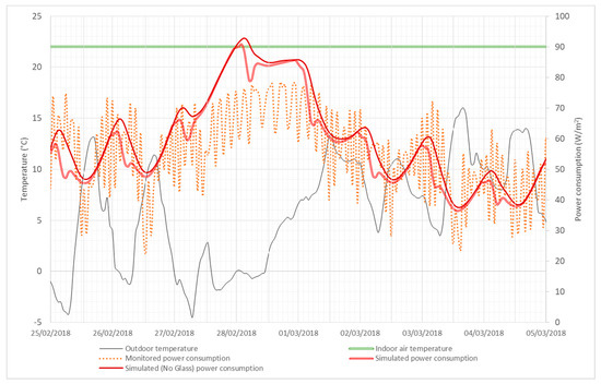 Figure 11 shows the outdoor temperature and the power consumption per square meter to maintain the indoor temperature at 22 °C. Monitored and simulated consumptions behave quite similar. The oscillation presented by the monitored power consumption of the heater is due to its control system. However, the trend line of the monitored consumption is similar to the simulation, which does not present these oscillations. The average power consumption for heating was 56.56 W/m2, for the analyzed period (Figure 6), having the maximum consumption around 90 W/m2 during the coldest days, for outdoor temperatures under 0 °C.