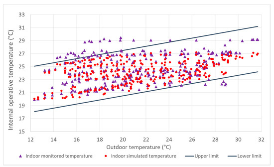 The application of the ASHRAE Standard 55 Adaptive Comfort model [32] to all the hours of the monitored summer solstice week is clearly shown in Figure 12, plotting the internal operative temperature for the Earthbag building as a function of outdoor temperature. Simulated values are included as well for comparison. Note that most of the points are either within the comfort adaptive range or only a bit above the upper limit (0.5–3 °C) or slightly below the lower one (0.5 °C). These results of satisfactory thermal comfort conditions are in good agreement with the found for an Earthbag dwelling in Ougadougou (Burkina Faso) by energy simulations [6]. Note that in this paper the Earthbag dwelling improved a 99% the discomfort degree-days with respect to the traditional Burkinable dwelling. Thus, these experimental results confirm the good performance of the Earthbag building to achieve thermal comfort in hot climates.