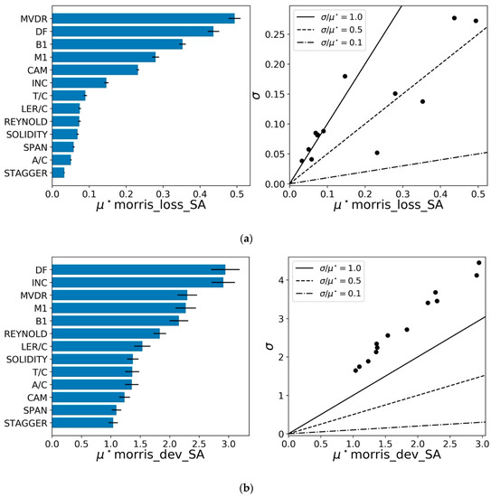 Sensitivity analysis of blade element database: (a) Elementary effect distributions of total pressure loss; (b) Elementary effect distributions of deviation angle.