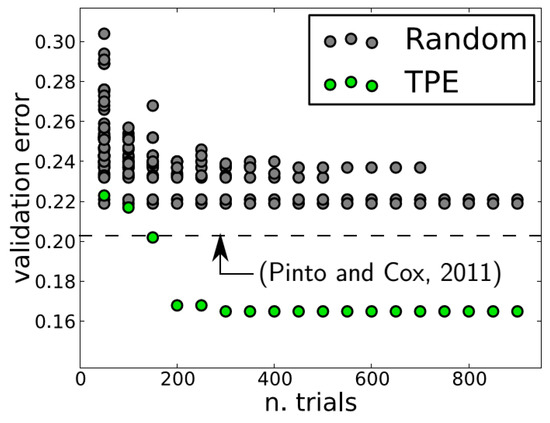 - Bergstra, J.; Yamins, D.; Cox, D.D. Making a science of model search: Hyperparameter optimization in hundreds of dimensions for vision architectures. In Proceedings of the 30th International Conference on Machine Learning (ICML 2013), Atlanta, Gerorgia, 16–21 June 2013. [Google Scholar]