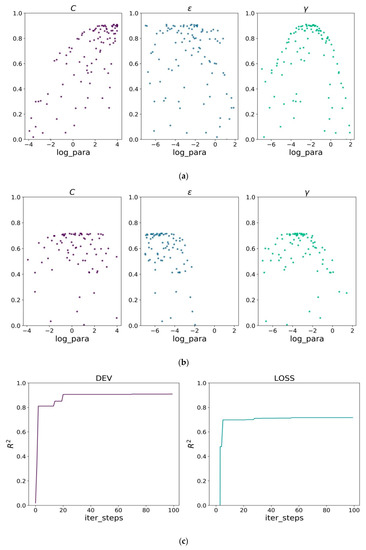 The coefficient of determination is used as the score of fitness function ( means the true target value, denotes the mean value of and is the prediction values by SVR). The target of optimization is to find an optimal set of hyper parameters maximizing the in which high value means good fit.