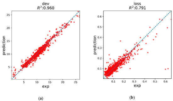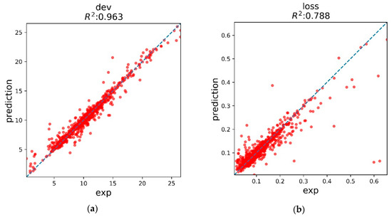 Validation of SVR models on the whole data set: (a) deviation angle; (b) total pressure loss.