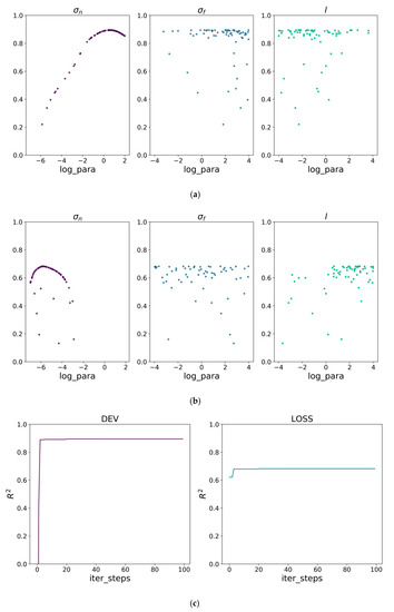 Figure 9a,b describes the hyper parameters tuning procedure of training GPR models for both targets. As in the SVR cases, both models have reached the highest over optimal hyper parameters (last 2 columns in Table 4) within the search domain. The optimization record curve in Figure 9c shows that both models converge in 20 iterations, which is faster than SVR. From Figure 9a,b, it is observed that affects the more than the other two. This indicates that the prior distribution of noise is the main influencing factor for the GPR model’s performance.