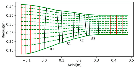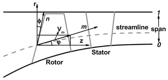 The dominated through-flow method streamline curvature approach is implemented here to simulate the flow field in the axial compressor, as well as its overall performance. Based on the general through-flow theory [30,31] and actively developed since the 1960s [32], SLC has been successfully applied to the design and analysis of various types of turbomachinery. It simplifies the computational complexity greatly from real 3D flow simulations in blade channels to solve the Euler equations on 2D (or quasi-3D) flow surfaces (Figure 11) on the premise of some assumptions including axial symmetric flow, adiabatic, steady, etc. The governing formulas are composed of a radial equilibrium equation and massflow continuity equation, with a constraint condition that the meridional velocity should be subsonic: