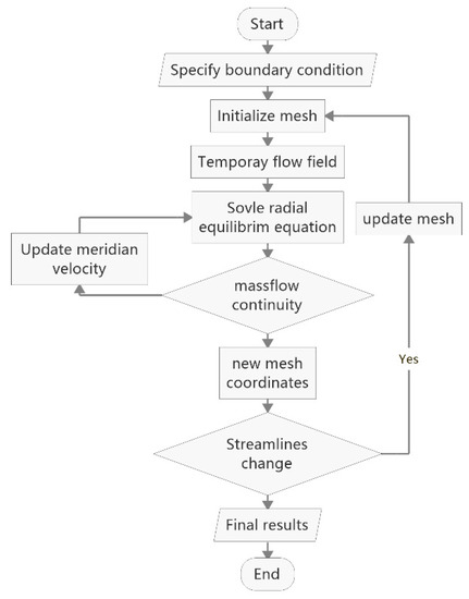 The computations are performed on the mesh grid formed by streamlines and quasi-orthogonal stations. The discrete governing equations are solved by finite difference with specified boundary conditions for loops until the location of streamlines do not change any more. A private SLC based through-flow program developed by the authors is applied for this work [33]. The structure of this program is shown in Figure 12. The entropy and swirl in the governing equations are updated by the total pressure loss and deviation angle formed below when solving the governing equations.