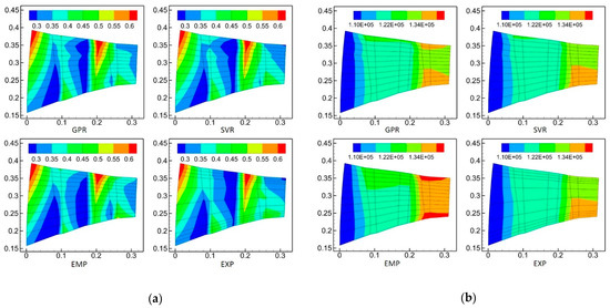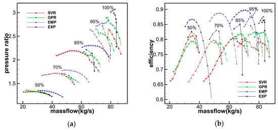 Figure 14 shows the overall performance maps of total pressure ratio (Figure 14a) and adiabatic efficiency (Figure 14b) computed by different types of models for the five rotational speed schemes. The experimental characteristic lines are also plotted for reference. SVR, GPR, EMP, and EXP represent SVR models, GPR models, empirical correlations and experimental data, respectively. In general, the SLC method has an intrinsic defect that is incapable of predicting performance in choke conditions very well, since mass flow is the input for flow continuity equation and needs to be adjusted to predict different performance. The SLC approach performs well for the operations points of low rotational speed, where the flow in blade channel is not yet choked. However, for configurations where the Mach number in the throat area of the blade channel is close to 1, which means the blade channel has reached the maximum capability of through-flow, the mass of the compressor remains constant, although the performance still changes. This situation usually happens in high rotational speed regions, where SLC has a higher prediction error with the experiment as shown. Some alternative methods are developed to solve this problem, such as the implementation of dedicated models for the choke regions, localized choked flow treatment [39], or time marching through-flow method [40], which is out of the scope of this article. For the comparison of the different models, treatment of this defect is not taken into consideration in this work.