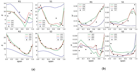 Figure 15 shows the distribution of deviation angle and total pressure loss along blade span for blade rows. In Figure 15a, the measured deviation angle basically distributes like a bucket shape, with higher values near endwalls and lower values in the mid-span, although a small difference exists in the first stage due to the effects of part-span shroud of R1 at 61% span location [13] The predictions of SVR and GPR models show a good agreement with the EXP data, while the empirical correlations overestimated in S1, and underestimated in the second stage. The underestimated deviation angle in rotors mainly results in a higher predicted total pressure ratio for empirical correlations, because for a certain airfoil, a lower deviation angle means higher turning flow angle as well as more energy provided. In Figure 15b, the SVR and GPR models also show a better performance than the empirical correlations for total pressure loss prediction. The underestimation mainly happens in the tip region of the first stage, where the actual total pressure loss is higher and makes the predicted adiabatic efficiency of empirical correlations much higher than the experimental data. In contrast, the SVR and GPR models accurately predicted the loss distribution for most span ranges, except the tip region of S1.