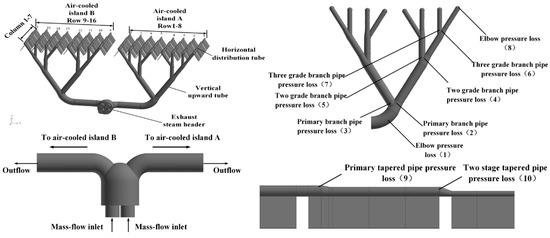 The details of the piping-main arrangement air-cooled system are shown in Figure 2. The steam is elicited by two main exhaust pipes with a diameter of 6 m, and goes into the exhaust steam header firstly. Then, the exhaust steam goes into the vertical upward steam distribution pipelines, which use a “Y” type branch arrangement with diameters of 3, 2.1 and 1.5 m, successively. Each steam distribution tube is connected with three segments of the horizontal shrinking distribution tubes, respectively.