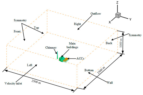 Meshes are created in the simulation domain consisting of a middle block and surrounding blocks. Tetrahedral unstructured grids are used in the middle block made up of the main building and ACCs. Structed grids are meshed in the surrounding blocks, the air-cooled condensers with adjacent zones are meshed tiny enough to accurately predict their air flow field. The grids of the remaining part are gradually increased to save computational resources. In the exterior air flow field, the grid size is set to 0.5 m for the fans and heat exchanger surface, while the grid size is set to 5 m for the main buildings and support structure surfaces. This division method can ensure the simulation accuracy, as well as the minimum computing resources after several tests.