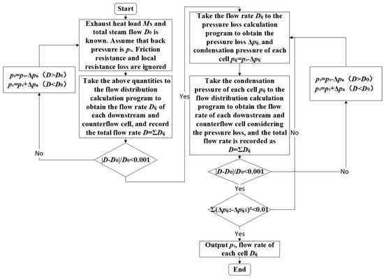 Take the last acquired pij, D0, and M0 as the input of the steam flow calculating program. When Equations (22) and (23) are satisfied, and the resistance loss of each ACC cell remains constant, the backpressure of steam turbine, ps, as well as the condensed steam flow rate, Dij, in each cell can be finally obtained.