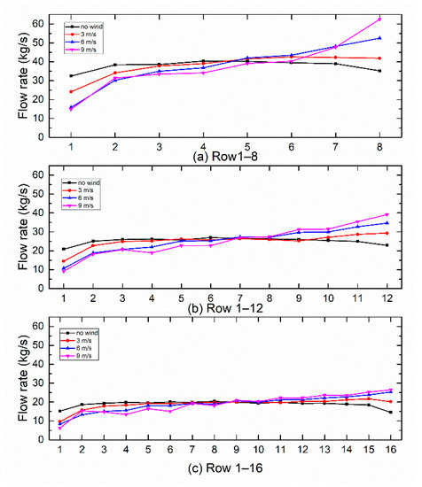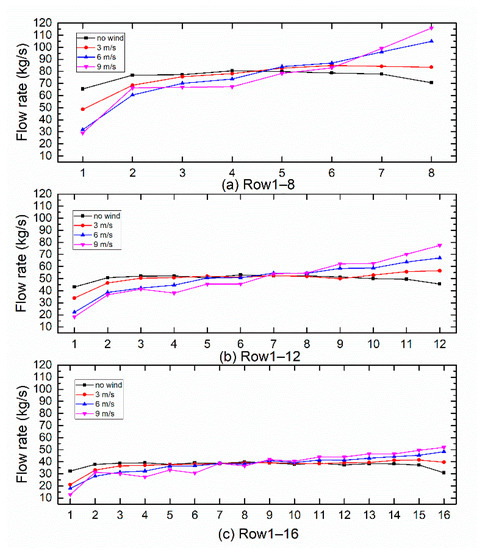 A total of 12 operation conditions are selected as representation, including different ambient winds with the speed of 0, 3, 6 and 9 m/s, and the operation strategies, with rows 1–8, 1–12 and 1–16 in operation, as shown in Figure 5.