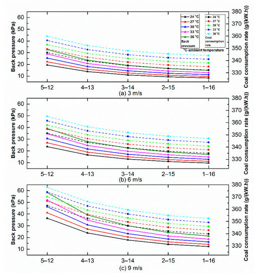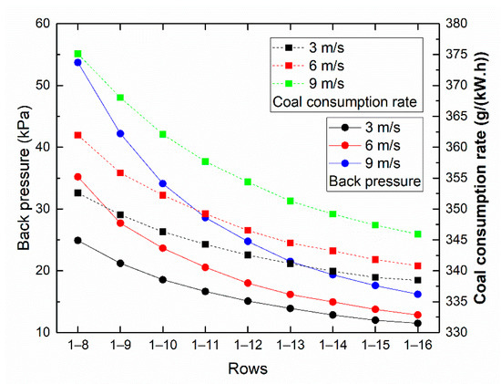 In order to clarify the factors affecting backpressure and coal consumption, 27 operating conditions including ambient wind speeds of 3, 6 and 9 m/s, and rows 1–8 to 1–16 of cells in operation are calculated. The back pressure and the coal consumption rate of all the conditions are illustrated in Figure 6.