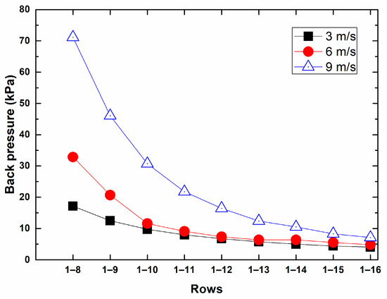 The operation strategies have relatively little influence on the backpressure under the ambient wind speed of 3 m/s as seen in Figure 6. The backpressure is 11.5 kPa, and the coal consumption rate is 338.46 g/kWh, corresponding to rows 1–16 in operation, while these values are 24.9 kPa and 352.58 g/kWh corresponding to rows 1–8 in operation.