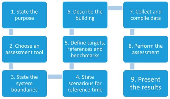 This study required the completion of nine steps, as shown in Figure 1. The first stage started with defining the aims of the study to quantify the environmental performance with crucial parameters, which were CO2 emissions in our case. This parameter itself is a reasonable means of assessing the climate impact as well as the embodied energy. The assessment was performed for four building types with 50-years life cycle in Nur-Sultan, Kazakhstan. The second stage required the identification of the assessment tool. The reason behind the choice of this particular tool was explained in the previous section. The third stage required the choosing a building reference time (50 years, in this case) as well as setting the system boundaries, which were limited to the embodied energy (materials manufacturing and transportation) and operational stage. The operational stage is concerned with energy use but does not consider household electricity use. The fourth stage required explaining the scenarios of the building life-cycle. In this case, it was assumed that buildings experienced no renovations and no change in the usage mode throughout their life-cycle.