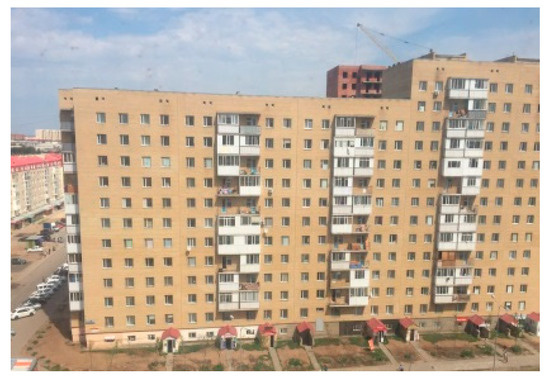 The first building type was the economy class (Figure 2). Construction started in 2015 and was completed in 2017. The building consists of 11 floors with apartments (three-to-four apartments per unit) and a ground floor with various amenities such as shops, cafes, and other commercial facilities. The indoor temperature in winter was anticipated to be a minimum of 20 degrees Celsius. The primary building materials of the external wall are concrete, clay bricks, and insulation (mineral wool).