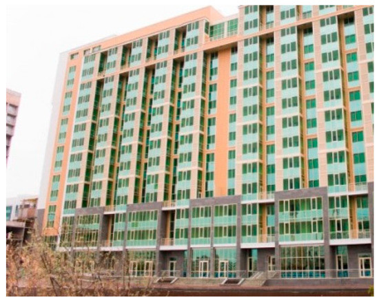 The third building type was the business class (Figure 4). Construction started in 2010 and was completed in 2016. The building consists of 13 floors, with floors two-to-thirteen being apartments with 12 flats per unit. The first floor consists of kinder gardens, shops, cafes, gym, and other commercial places. The indoor temperature in winter was anticipated to be 22 degrees Celsius. The primary building materials of the external wall are reinforced concrete, clay brick, insulation (mineral wool), and a facade tiled with gypsum tiles.