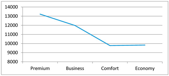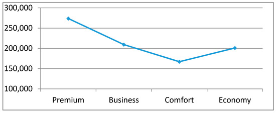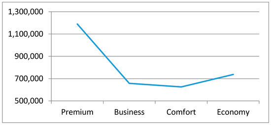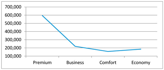 Figure 6 and Figure 7 present the data on total heat use and impact (kg CO2 equivalent) concerning building comfort level, respectively. The total energy utilization in the selected building types (Table 2) indicates that all the selected buildings are “A+ class” energy class buildings with less than 25 kWh/m2 energy consumption per year [18]. According to Figure 8, it can be observed that there was a strong correlation between comfort level and environmental impact. Specifically, the higher the comfort levels, the higher the impacts in terms of CO2 equivalent. This was most likely related to the fact that the higher the comfort level, the higher the environmental cost of the materials. There are also fewer occupants per square meter as the comfort level increases. Comfort and economy class buildings presented the same levels of impact per m2. This can be explained by the similar types of construction materials used in the respective building envelopes. A positive correlation could be observed when comparing building comfort levels and life-cycle impacts per user. According to Figure 9, the higher the comfort level (fewer occupants), the higher the overall impact. While the trend seemed to stabilize across the economy, comfort, and business classes (which were found to have approximately four, four, and three occupants, respectively), it seemed to change dramatically in premium class buildings, which were found to have only two occupants.