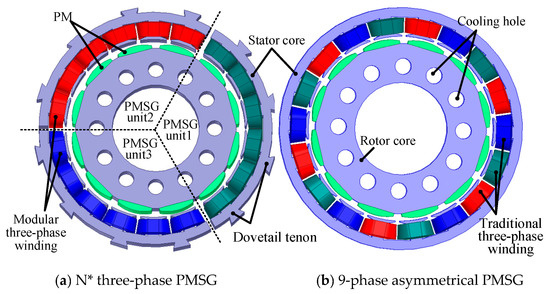 - The N* three-phase PMSG proposed in this paper is composed of several three-phase generator units with the same electromagnetic characteristics. Each generator unit has advantages of good electrical isolation, simple structure and strong fault tolerance.