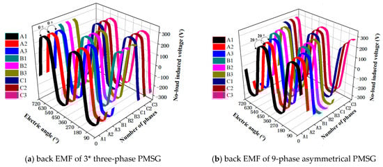 Figure 4 shows the no-load back EMF of the 3* three-phase and asymmetric 9-phase PMSG. The phase shift between each winding can be clearly seen from the FEA results. The asymmetric 9-phase PMSG is distributed in triple three-phase sets with a 20 electrical degrees shift. However, in the 3* three-phase PMSG, both A2–B2–C2 and A3–B3–C3 represent three-phase windings in phase with A1–B1–C1. All three windings are distributed along 120 mechanical degrees along the stator circumference, which is completely consistent with the analysis in Figure 3. Compared with the asymmetric 9-phase PMSG, the coil length from phase A1 to A1’ of the 3*three-phase PMSG is the shortest and the copper loss is lower for this configuration. However, to further reduce the mutual inductance among the three-phase windings, the fractional slot concentrated winding is often used, as shown in Figure 3. The frequency spectrum analysis shows that the third harmonic is about 5.13%, the fifth harmonic is about 8.69%, and the seventh harmonic is about 6.72%, which means the content of low order harmonics is higher.
