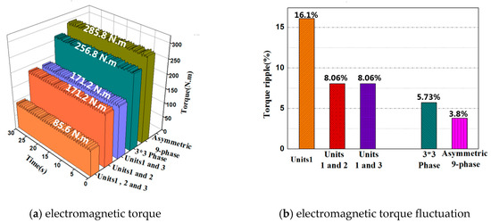 Figure 5 shows the torque curves of the 3* three-phase PMSG and asymmetric 9-phase PMSG. One or two of the generator units are in-service with the same current excitation and the rest are out-of-service. Thus, the torque for each individual unit can be obtained. It can be seen from the Figure 5a that the three-phase generator units 1, 2 or 3 of the 3* three-phase PMSG has the same electromagnetic torque. The electromagnetic torques of generator units 1 and 2 are equal to that of the generator units 1 and 3, which is twice the electromagnetic torque of generator unit 1. The electromagnetic torque of generator units 1–3 (i.e., 3* three-phase generator) is three times that of generator unit 1. It can be concluded that the torque of each generator unit is the same and the total electromagnetic torque of the N* three-phase PMSG is the sum of each generator unit, which means the electromagnetic torque of the generator unit of the N* three-phase PMSG has good independence and superposition characteristics. Figure 5b shows the torque ripple of the asymmetric 9-phase PMSG and 3* three-phase PMSG. It can be seen from the Figure 5b that the torque ripple of the asymmetric 9-phase PMSG is much smaller than that of the 3* three-phase PMSG. The 3* three-phase PMSG is essentially a three-phase generator with FSCW. The winding magnetomotive force contains ample low-order harmonics, such as 5, 7, 11 and 13, which are higher than the of asymmetric 9-phase PMSG. The higher harmonic content of the magnetomotive force increases the torque ripple and reduces the average torque at the same time.