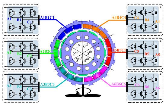 An N* three-phase PMSG consists of n sets of three-phase PMSG units and the electromagnetic characteristics of each unit are identical. Therefore, one three-phase PMSG unit is controlled and the other PMSG units adopt the same control method, which means one set of the control strategy is used to realize the control of n sets of inverters. Compared with the multi-phase PMSG control strategy based on VSD, the control method proposed in this paper is simple and easy to implement. Even if a three-phase PMSG unit fails, other units could still operate normally. Figure 8 shows a schematic diagram of the connection between the N* three-phase PMSG and the side converter (n = 6).