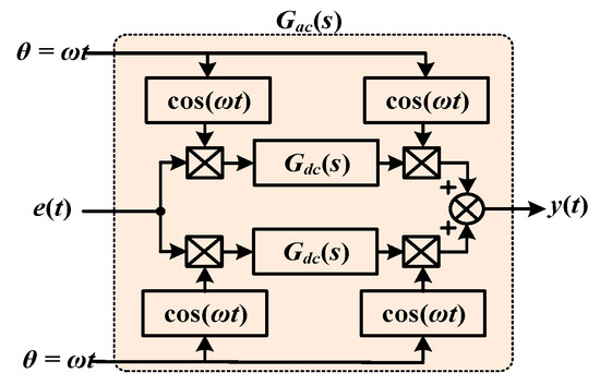Considering the above analysis, to reduce the coupling effect among the three-phase PMSG units, the FSCW is mostly used in an N* three-phase PMSG. The current of the generator-side converter contains abundant low-order harmonics, which have a great influence on generator performance and should be suppressed. However, the vector control strategy based on rotor field orientation is generally adopted in the generator-side control of a direct drive PMSG. Its controller usually selects the traditional proportional integral (PI) regulator. The PI controller could effectively realize steady-state error-free control of the DC signal in the synchronous rotating coordinate system. However, to achieve the control of the AC signal, the AC signal needs to be converted to the DC signal and then back to the AC signal. The process of signal conversion is very complicated. Figure 9 shows the transformation block diagram of the AC–DC equivalent transfer function.