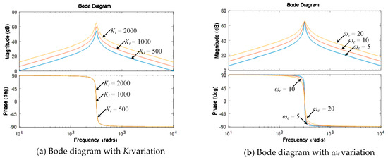 Kp and Ki are the ratio and integral coefficients of PI, h is the number of harmonics, and Khwi is the resonance gain coefficient of ith harmonic. Concerning the PI-NRC controller, the proportion coefficient has been determined in the design of the PI controller, so the harmonic signal can only be controlled by adjusting the parameters Ki and ωc of the resonance controller. Assuming the angular frequency of the controlled object ω = 314 rad/s, ωc = 10 and keeping Ki unchanged, the transfer function Bode diagram corresponding to Equation (14) is shown in Figure 10a. Through the adjusting of Ki, the amplitude-frequency curve can be shifted up or down, which not only affects the controller gain, but also affects the controller bandwidth. Therefore, in an ideal situation, the adjustment without static difference of the AC harmonic signal can be realized by a reasonable Ki, eliminating the harmonic.