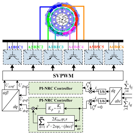 Regarding the case of multiphase PMSG control, the implementation of multiphase PMSG control is usually based on a multiple direct-quadrature axis (d-q) and vector space decomposition (VSD) modeling approach. The advantage of a multiple d-q modelling approach is the information on the individual d-q current is directly available so current references for arbitrary power-sharing are formulated easily. However, the multiple d-q approach leads to heavy cross-coupling between individual winding sets, which requires compensation in the control system [17,18,19]. The VSD modeling method of multiphase PMSG could avoid the problem of flux linkage coupling between multiple windings and dramatically reduces the difficulty of system control [20,21]. However, with the further increase of the number of phases (≥7), the multi-phase PMSG mathematical model obtained by VSD is very complex, which greatly increases the difficulty of analysis and the design of the controller. To overcome the shortcomings mentioned above, a new modular permanent magnet synchronous motor (PMSM) is proposed in references [22,23,24]. The machine is mainly composed of multiple three-phase PMSM units with the same electromagnetic characteristics. Each unit has excellent electrical and magnetic isolation characteristics, and the cross-coupling between each motor unit is minimal. However, to modularize manufacturing and further weaken the coupling between the three-phase PMSM units, the fractional slot concentrated winding (FSCW) is often used. Compared with the generator adopting short pitch distributed winding, the current harmonic content of the generator-side converter with FSCW is higher [21,22]. A large number of harmonics will increase the copper and iron consumption of PMSG, reduce the efficiency of the power generation system and cause generator torque ripple.