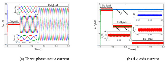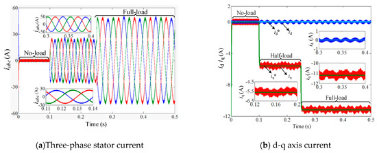 Figure 12 shows the current waveform of a 6* three-phase PMSG simulated by a traditional PI controller. Figure 12a shows the current waveform of one generator unit of a 6* three-phase PMSG. It can be seen from the figure that harmonic current always exists in a three-phase PMSG unit in half-load and full-load, and the sinusoidal degree of the stator current waveform is poor. It is found by Fourier decomposition that the odd-harmonic content in stator current is higher, among which the 5th and 7th harmonic content is the largest. Figure 12b is the current waveform of the three-phase PMSG unit in the d-q coordinate system. It can be seen from the figure that the current iq under full-load is twice as much as that under half-load. The d-q axis current response could well follow the given current, and the static error in steady-state is small. There also are apparent fluctuations in the d-q axis current.