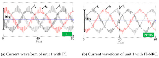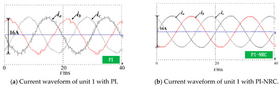 Figure 16 and Figure 17 show the current test waveforms of a three-phase PMSG unit 1 with a PI and PI-NRC controller at different speeds. According to the test results, the current harmonics can be suppressed by adopting the PI-NRC controller under different speed conditions. Compared with the traditional PI controller, the PI-NRC controller proposed in this paper has an obvious effect on harmonic suppression.