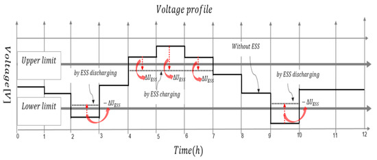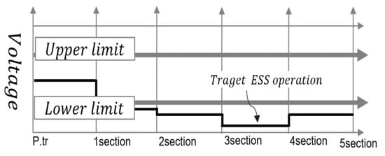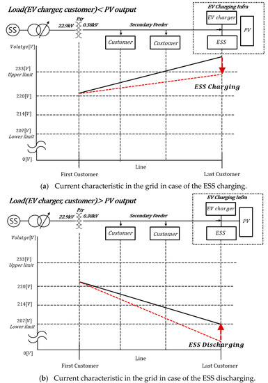 First, the rated capacity (maximum current) of the secondary feeder through visual inspection is confirmed. In addition, the voltage characteristics from the pole transformer to the end section are analyzed by each voltage characteristic for heavy load and a maximum output of the renewable energy resource. After that, secondary feeder voltages with EV infrastructure are controlled within the allowable limit (upper limit, lower limit) by charging and discharging of the ESS as much as the voltage () out of the limit capacity of the secondary feeder. This concept is expressed in Figure 5.