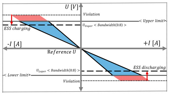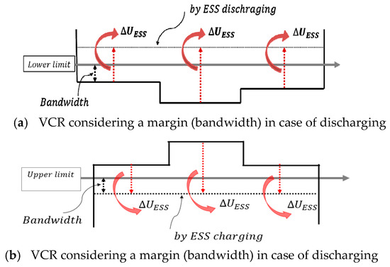 On the other words, the voltage is compensated by the ESS to as much as the voltage () limit capacity of the secondary feeder and is defined as the voltage compensation rate (VCR). In this case, the secondary feeder is stabilized by the ESS operation with a charging/discharging value in which the VCR is converted into active power. However, the ESS can have problems when the VCR is terminated to the upper limit and lower limit warnings frequently. Therefore, this paper presents a setting method of the VCR with a margin, as shown in Figure 6. Specifically, the margin (bandwidth) is applied to the under area of upper limit and the over area of the lower limit, and the ESS is operated by considering the VCR and bandwidth coefficient.