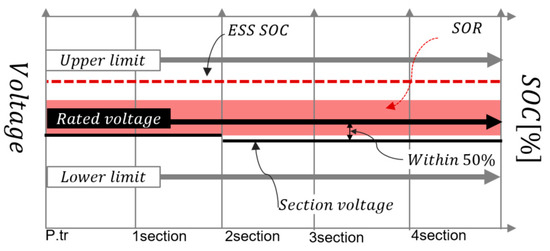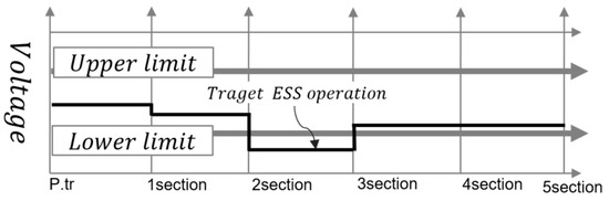 [STEP 5] On the other hand, when the ESS does not operate as a voltage stabilization function, it is possible to determine the SOR operation. First, in case all section voltages of the secondary feeder are satisfied within the allowable limit, the charging and discharging signal of the ESS must be determined as and from [STEP 2]. Therefore, all feeder voltages should be kept within the target ± value () range, which is the set value between the rated voltage and limit voltage (upper limit and lower limit). Therefore, when all of the above conditions are satisfied, the primary condition signal (γ) for the SOR operation of the ESS becomes “γ = 1”, as expressed by Equation (11). Where, to prevent frequent operation at the SOR operation condition, target ± margin, which means the proper value between the rated voltage and limit values, is applied to setting the voltage range for the SOR operation. The charging and discharging of the ESS for the SOR operation will be determined at the next step.