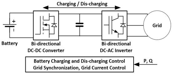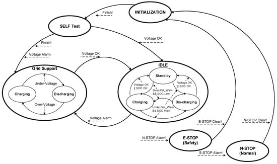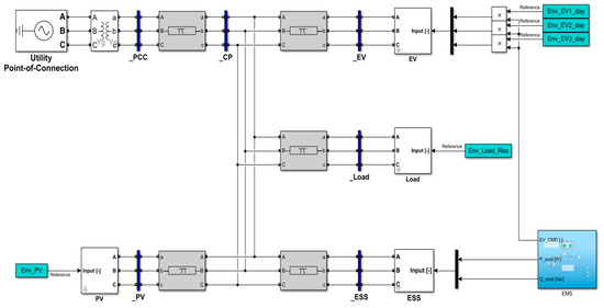 The ESS for voltage stabilization, which is connected to the EVC infrastructure in the low voltage distribution system, consists of a battery that is able to charge and discharge energy and a DC/DC converter that is responsible for bi-directional power flow through voltage control, and an inverter that is in charge of synchronizing with the AC system. As shown in Figure 13, the ESS modeling is constructed to follow the command value from the supervisory controller, such as an energy management system (EMS). Therefore, it is controlled by the proposed algorithm.