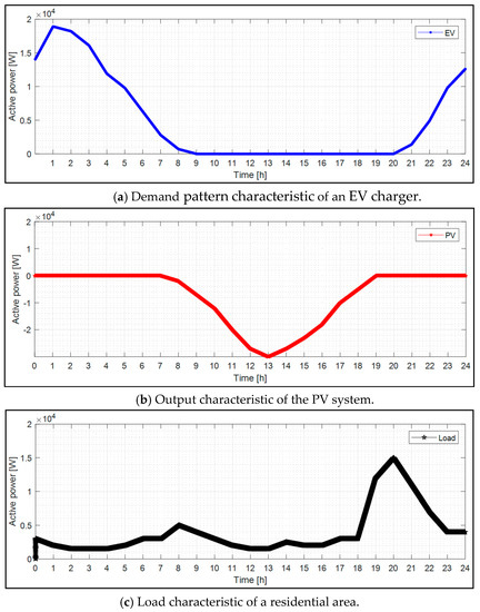 The load pattern, the output of RES with the PV system and the demand pattern of EV charger was predicted, as shown in Figure 18. The above patterns were simulated by the operation characteristics under the 30 kW scale based on the EVC infrastructure capacity. EV charging was assumed as standard 3 EV chargers having 7.7 kW capacity. In addition, the PV system assuming a renewable energy resource was considered as equal capacity to the total EV charger capacity. Furthermore, the load pattern was assumed by the residential profile in KOREA.