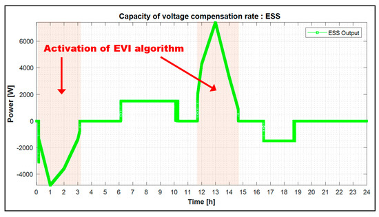 On the other hand, the output of the ESS when ESS voltage stabilization is operated as function, as shown in Equation (14), is determined by the impedance value from Section 2, the voltage compensation rate from [STEP 7], and measuring average voltage from [STEP 3].