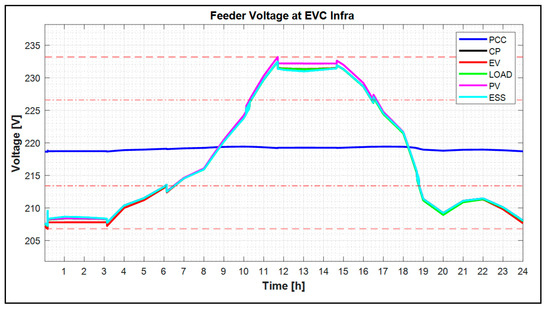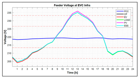 Figure 21 means the feeder voltage characteristics at the EVC, consumer, and PV sections in the EVC infrastructure site without the ESS. Here, the feeder voltage was analyzed as an average value per 10 minutes from 00:00 to 24:00 (all time). From the results of the simulation, it shows that the feeder voltage could not be maintained to reasonable conditions (over-voltage phenomena) at 11:50–14:20 when the PV system generated the maximum output, as shown in Figure 21. In addition, at 00:00–03:00, the feeder voltage was also less than the lower limit due to the energy demands of the EVC and customer. Therefore, the feeder voltage could not be exactly maintained within the allowable limits because the voltage was not compensated by the ESS.
