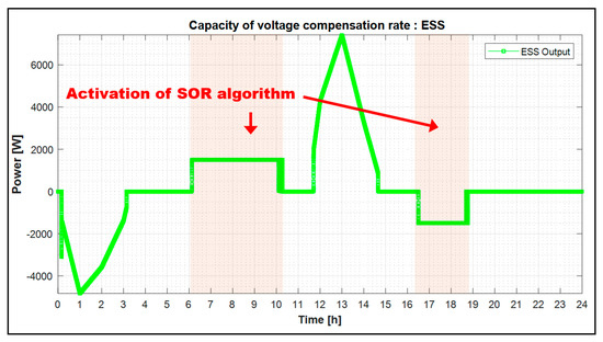 In this step, the SOR operation of the ESS, expressed by Equation (15), is carried out when the ESS does not operate as a voltage stabilization function. In order words, the ESS performs at about 1/4 of the ESS rated capacity [kW] when it is assumed as signal(γ) = 1, signals (ϵ,δ) = 1.0 or (ϵ,δ) = 0.1. Here, γ signal, ϵ, and δ signals are the results values that occurred from [Step 5] and [Step 6]. In addition, the + of means the ESS discharging state and −value means the ESS charging state.