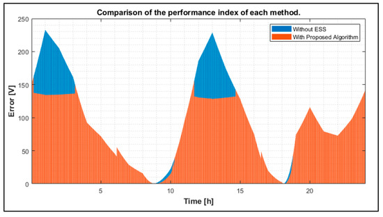 Figure 26 and Table 4 show the performance index by the introduction of the ESS at the EVC infrastructure site with renewable energy sources in the secondary feeder. Based on the result of the performance index based on Table 4, it is confirmed that feeder voltages in the distribution system (secondary feeder) can be maintained within the allowable limit. Therefore, the case study results show that this strategy is an effective tool to solve the voltage problems by an ESS.