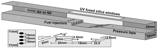 The cavity-based model scramjet combustor used in this paper consisted of a 500 mm-long rectangular duct with a constant cross-section of 52 × 25 mm, as shown in Figure 1. The inlet of the model scramjet combustor was located at the exit of the facility’s Mach 4 contoured nozzle. The cavity was installed on the bottom wall inside the combustor, 152.5 mm downstream of the inlet. It was 5 mm deep and had a 22.5° rear ramp angle. The length-to-depth ratio of this cavity was 4.8, which qualified it as an open cavity [4]. The length was defined as the distance from the cavity’s leading edge to the midpoint of the angled rear ramp wall.