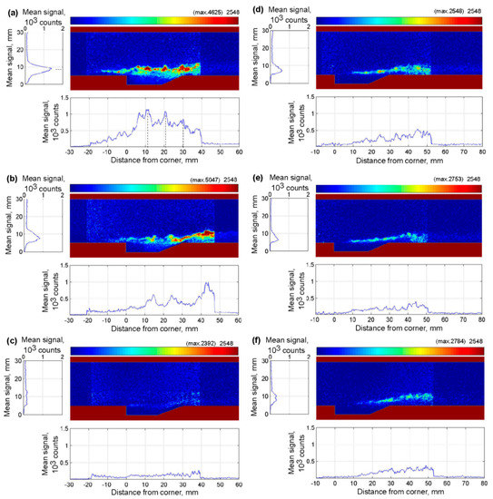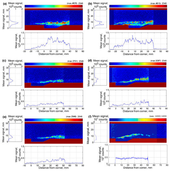Figure 2 shows OH distributions near the cavity for the three different fuel injection types of h0 = 6.45 MJ/kg. Figure 2a,b shows the angled injection whereas Figure 2c,d shows parallel injection, and Figure 2e,f shows upstream injection. For all the images in Figure 2, the total enthalpy of the tunnel flow was h0 = 6.45 MJ/kg, except in the case of Figure 2f where h0 = 6.28 MJ/kg, even very close. The vertical and horizontal plots indicate the horizontal and vertical OH fluorescence signal counts averaged along the height and width, respectively, of the PLIF image. These plots clearly show the extent of the combusting portion of the shear layer and the distance from injection to where OH generation occurred in the flow. A region slightly downstream of the laser sheet was included in the images to allow a direct comparison of the relative size of the fluorescence and chemiluminescence signals. Note that for each of the images, the color map was scaled to the maximum signal intensity of Figure 2e, to make it easier to compare between the images. Higher signals than the maximum count were cut off to remove some artificially high signal values at the edge of the laser sheet caused by the intensity normalization procedure, where normalizing to low laser intensities at the edge of the sheet can bias the measured OH fluorescence signals. The actual maximum count for each image is shown above the color bar at the top right of each image.
