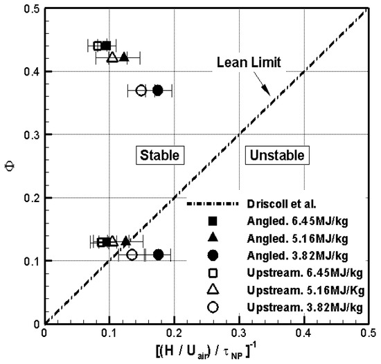 Figure 4 shows the results of comparison among the lean stable flame limits according to the fuel injection location, equivalence ratio, and correlation plots of Driscoll and Rasmussen [26]. The horizontal axis represents the inverse of the non-premixed Damköhler number and the vertical axis is the global equivalence ratio. Each horizontal error bar indicates the standard deviation of inverse Damköhler number and the error ranges of equivalence ratio are smaller than the symbol sizes. Here, two different non-premixed flame timescale, , are shown according to the global equivalence ratio was based on unity. However, the maximum global equivalence ratio in this study was below 0.5, so Figure 4 includes only the lean limit plot. Comparing the Damköhler numbers for angled fuel injection and upstream fuel injection, Figure 4 shows the effect of injection location on the flame stabilization.