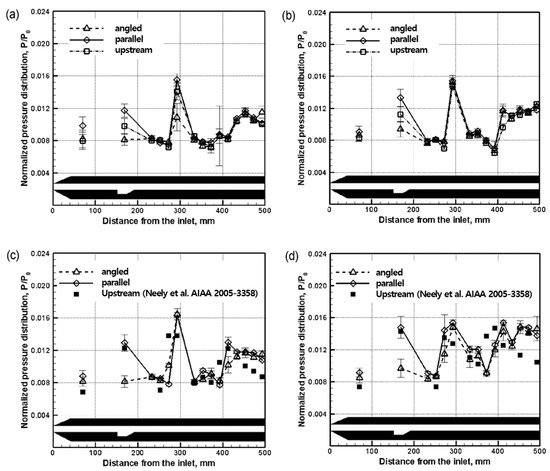 Wall pressure distribution of three different fuel injections: (a) non-reacting flow, Φ = 0.13; (b) reacting flow, Φ = 0.13; (c) non-reacting flow, Φ = 0.44; (d) reacting flow, Φ = 0.44.