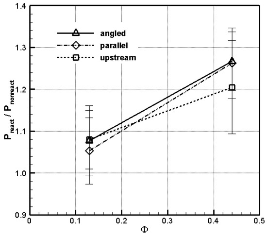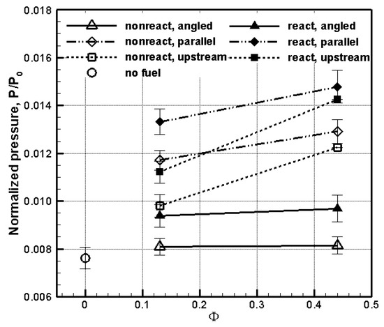 Figure 8 shows averaged ratios of reacting to non-reacting pressures for the nine pressure transducers downstream of x = 300 mm. This point was chosen for the comparison because the cavity trailing edge oblique shock reflected near x = 300 mm for all fuel injection methods, and combustion effects increased behind this point. Low equivalence ratio conditions showed similar averaged pressure ratios of about 1.05–1.08 for all injection methods. However, for the high equivalence ratio, the upstream fuel injection method showed a lower averaged pressure ratio compared with the other fuel injection methods, and this difference was about 5%, although it was within the error bars of the other two measurements. Therefore, even though the fuel injection locations were different, it had less effect on the average pressure increase downstream of the combustor in this experiment.